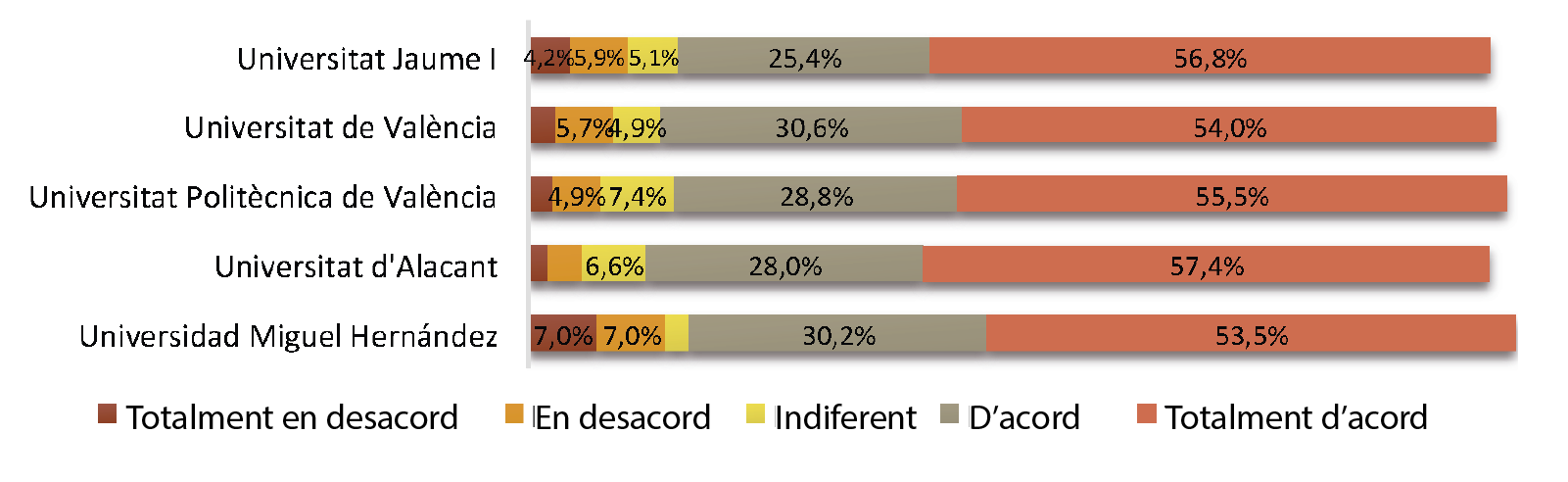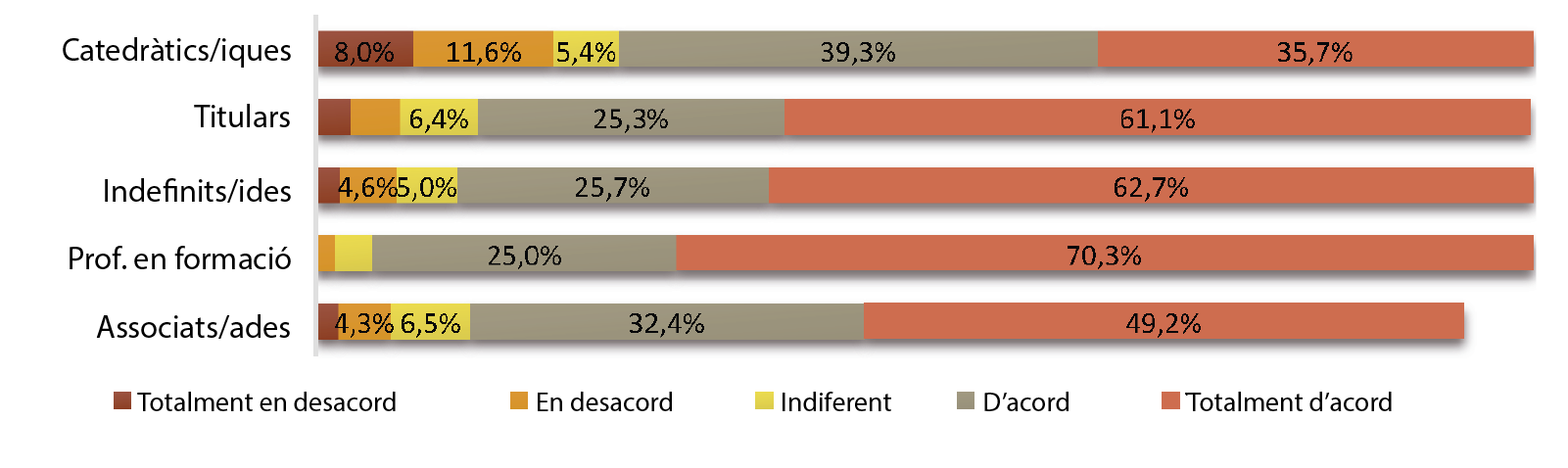 Distribució percentual del grau d’acord amb “el reconeixement acadèmic es mesura majoritàriament en relació a la recerca publicada”.