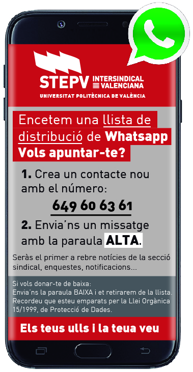 A partir de hoy, desde la sección sindical de STEPV en la UPV abrimos una nueva via de comunicación. Queremos acercarnos a ti y ponemos en marcha una lista de distribución por WHATSAPP.